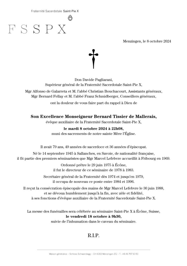 Mardi 8 octobre 2024 à 22H, Mgr Bernard Tissier de Mallerais à rejoint Dieu le Père depuis l’hôpital où il était plongé dans le coma des suites d’une chute dans les escaliers du séminaire d’Écône (Suisse),le matinée du 28 septembre.