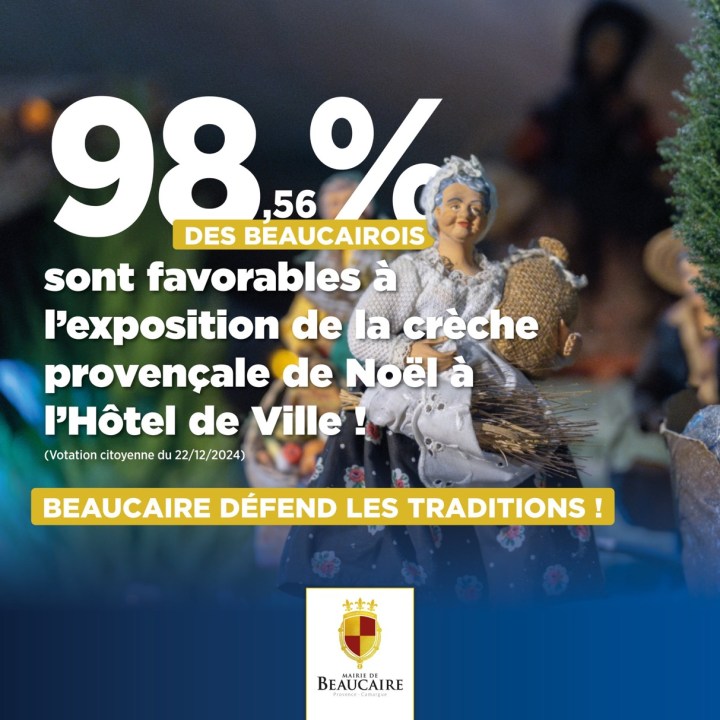 Une consultation populaire historique a eu lieu à Beaucaire, où les citoyens étaient invités à se prononcer sur l’exposition de la crèche provençale de Noël à l’Hôtel de Ville. Avec un résultat sans appel, 98,56 % des votants se sont exprimés en faveur de cette tradition locale, confirmant l’attachement profond des Beaucairois à cet élément emblématique de leur patrimoine culturel et religieux, et donc aux racines de ce qui fait l’histoire de la ville et la France : La Chrétienté !